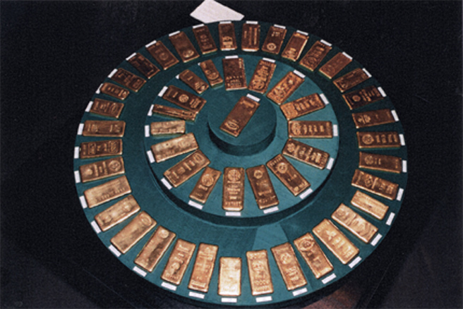 A 'package' exhibition previously shown in Australia. The design task was to devise a setting for exhibits which could not be seen beforehand, and which were both numerous and small; and to harmonize these with narrative graphic panels. The presentation of gold objects presents special problems in the choice of background: here a rich green fabric was combined with brushed perspex.