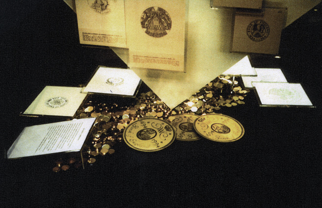 The task here was to show the design of a quite tiny object, a coin, in a way which had a large-scale impact. The geometric fitments of circles and lozenges, attract the eye, and coins are scattered in profusion to give sparkle.